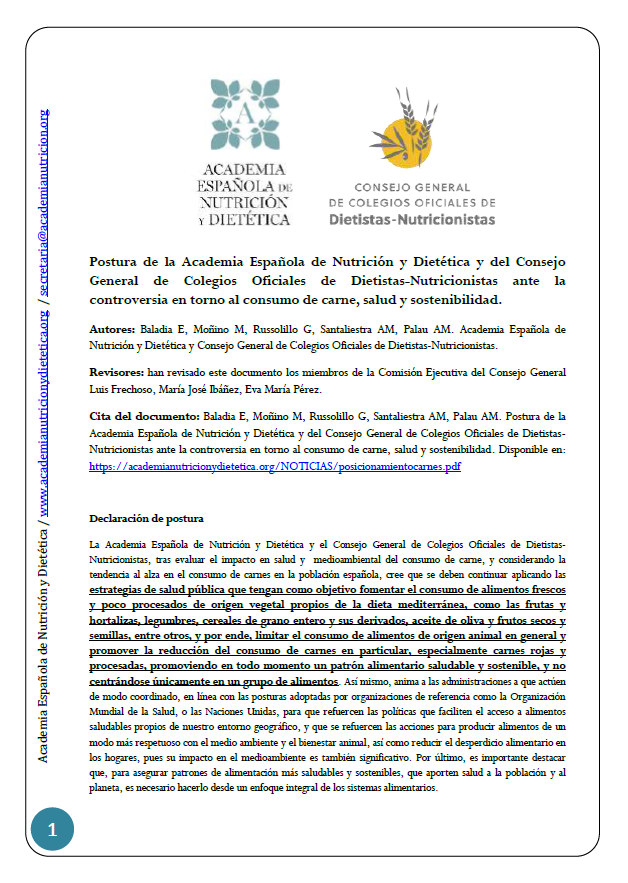 La Academia y el Consejo, tras evaluar el impacto en salud y medioambiental del consumo de carne y considerando la tendencia al alza en el consumo de carnes en la población española, cree que cal continuar aplicant les estratègies de salut pública que tinguin com a objectiu fomentar el consum d'aliments frescos i poc processats d'origen vegetal propis de la dieta mediterrània, com les fruites i hortalisses, llegums, cereals de gra sencer i els seus derivats, oli d'oliva i fruits secs i llavors, entre d'altres, i per tant, limitar el consum d'aliments d'origen animal en general i promoure la reducció del consum de carns en particular, especialment de carns vermelles i processades, promovent en tot moment un patró alimentari saludable i sostenible, i no centrant-se únicament en un grup d'aliments.