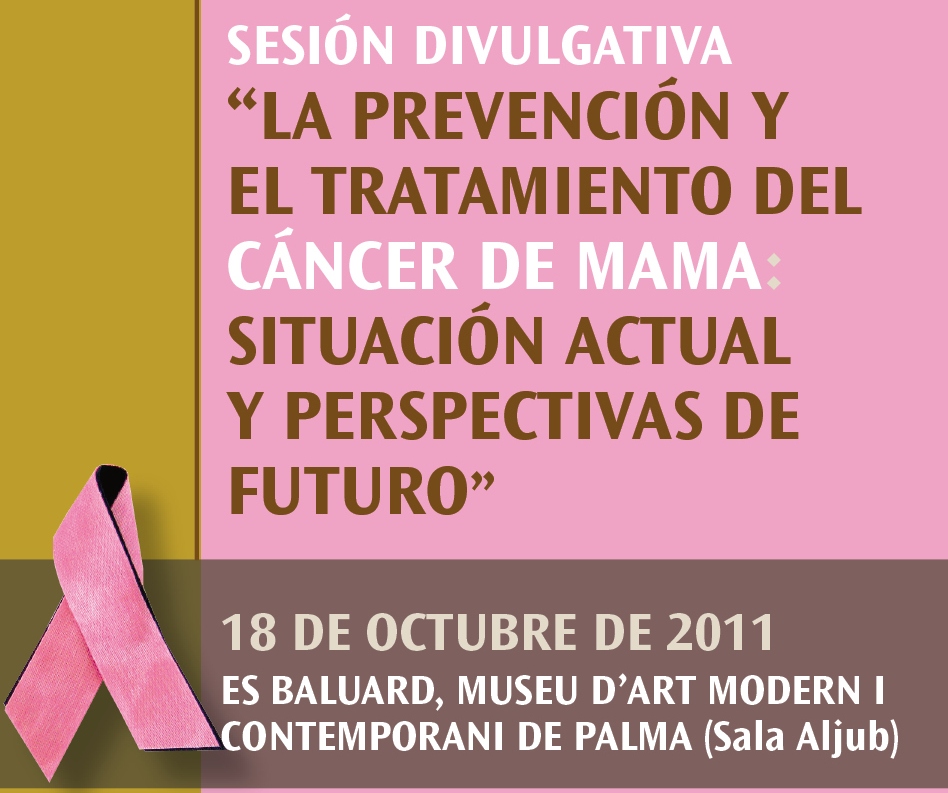 La Junta de Balears de la Asociación Española Contra el Cáncer tiene el placer de invitarles a la Sesión Divulgativa “Prevención y Tratamiento del Cáncer de Mama: Situación actual y Perspectivas de Futuro” enmarcada dentro de las actividades previstas para la Campaña Día Contra el Cáncer de Mama 2011, la cual tendrá lugar día 18 de octubre a las 18,00 h. en la sala s’Aljub del Museo de Arte Moderno y Contemporáneo Es Baluard.